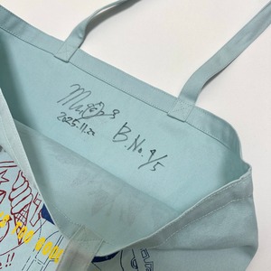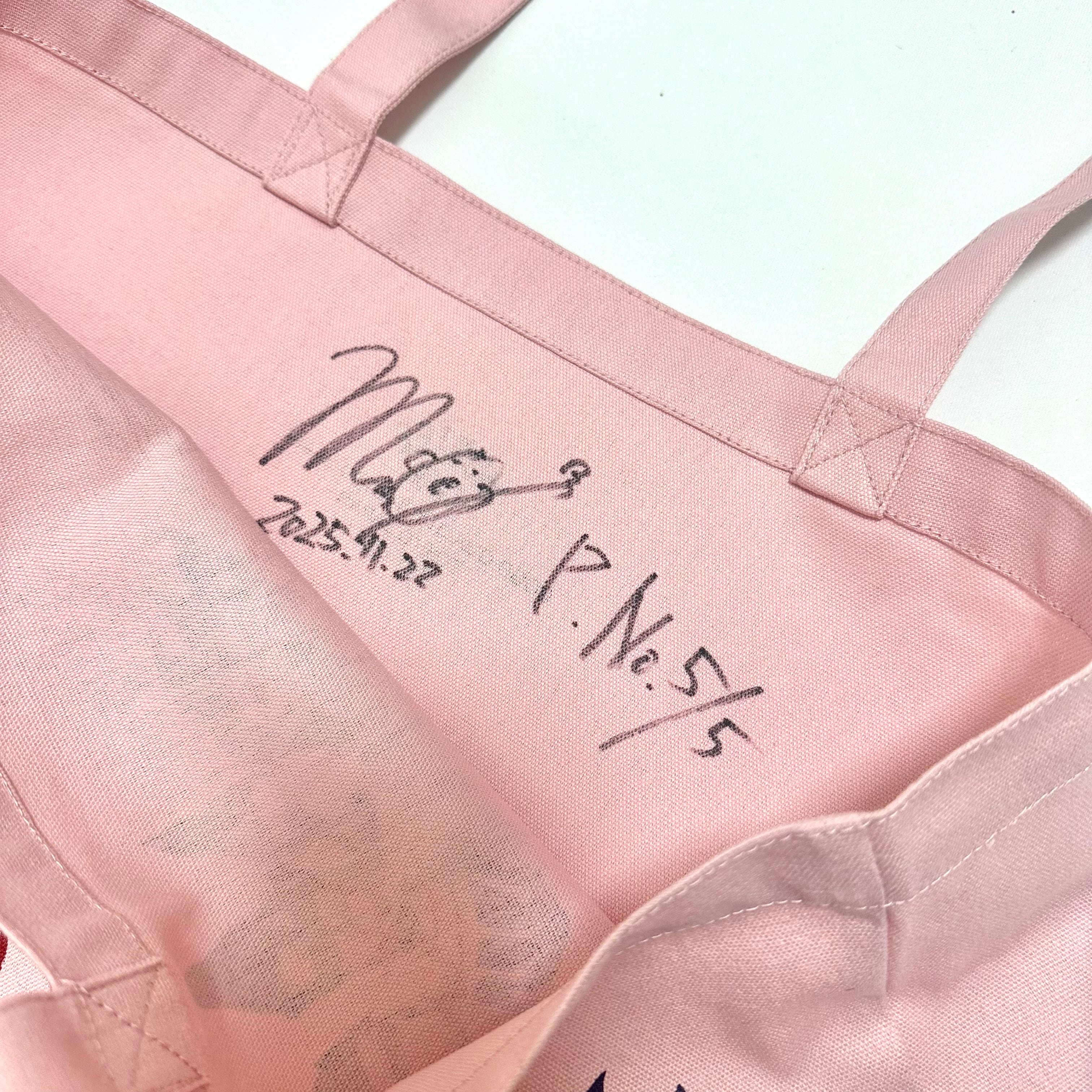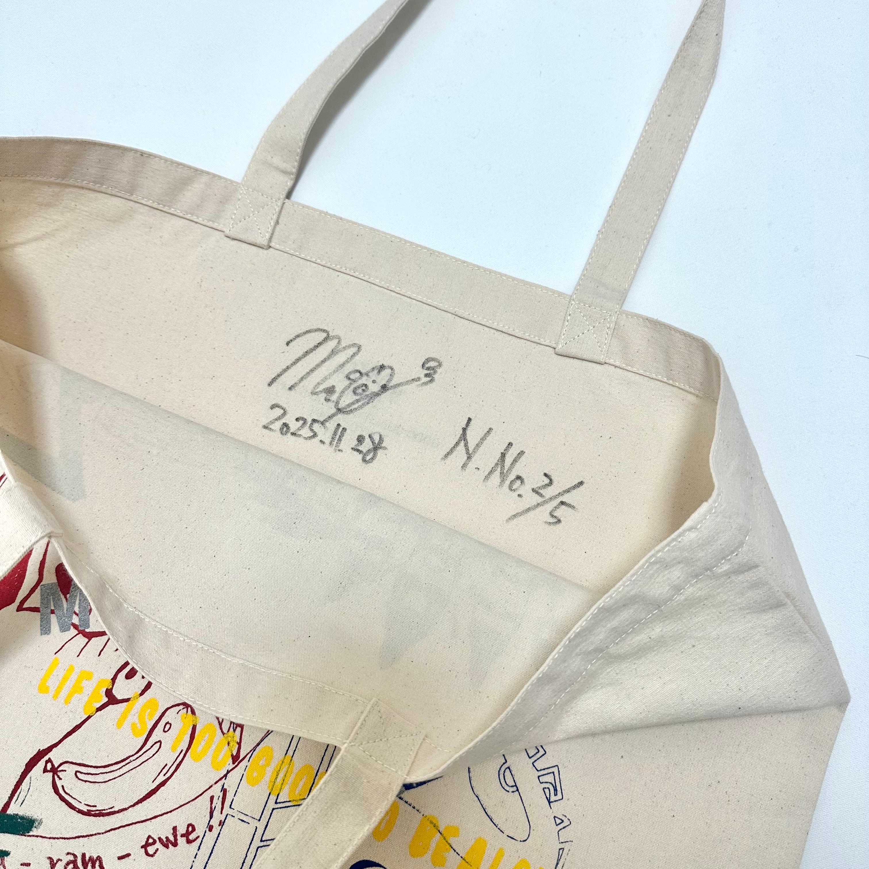 トートの内側に深水元基のサイン、制作日、商品カラー&番号が書いてあります。